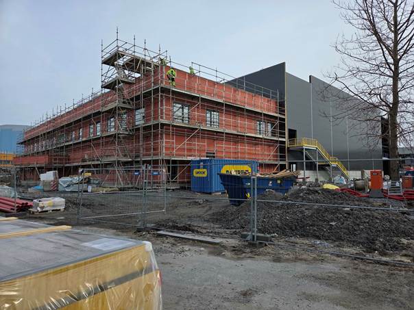 Prosjektet har god fremgang så langt i år, og alle vegger er stort sett lukket. Sandwich elementer er montert og vinduer er nesten ferdig montert i frontbygg. Takarbeidet er godt i gang, og jobben der vil fortsette over påsken. Jobb inne i hallen med tanke på bunnledninger og forarbeid til gulvlegging vil også fortsette etter påsken.