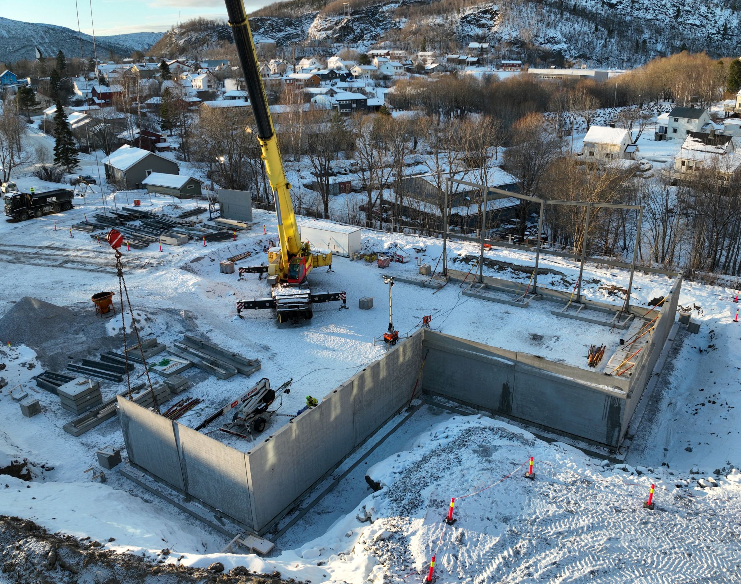 Fra høsten 2025 har byggeplassen blitt etablert, første del av det eksisterende skolebygget er revet, og grunnarbeider er godt i gang. Ved inngangen til det nye året ble byggetomten ferdigstilt og klargjort for utplassering av fundamenter, og råbyggsmontasjen er nå i full sving.