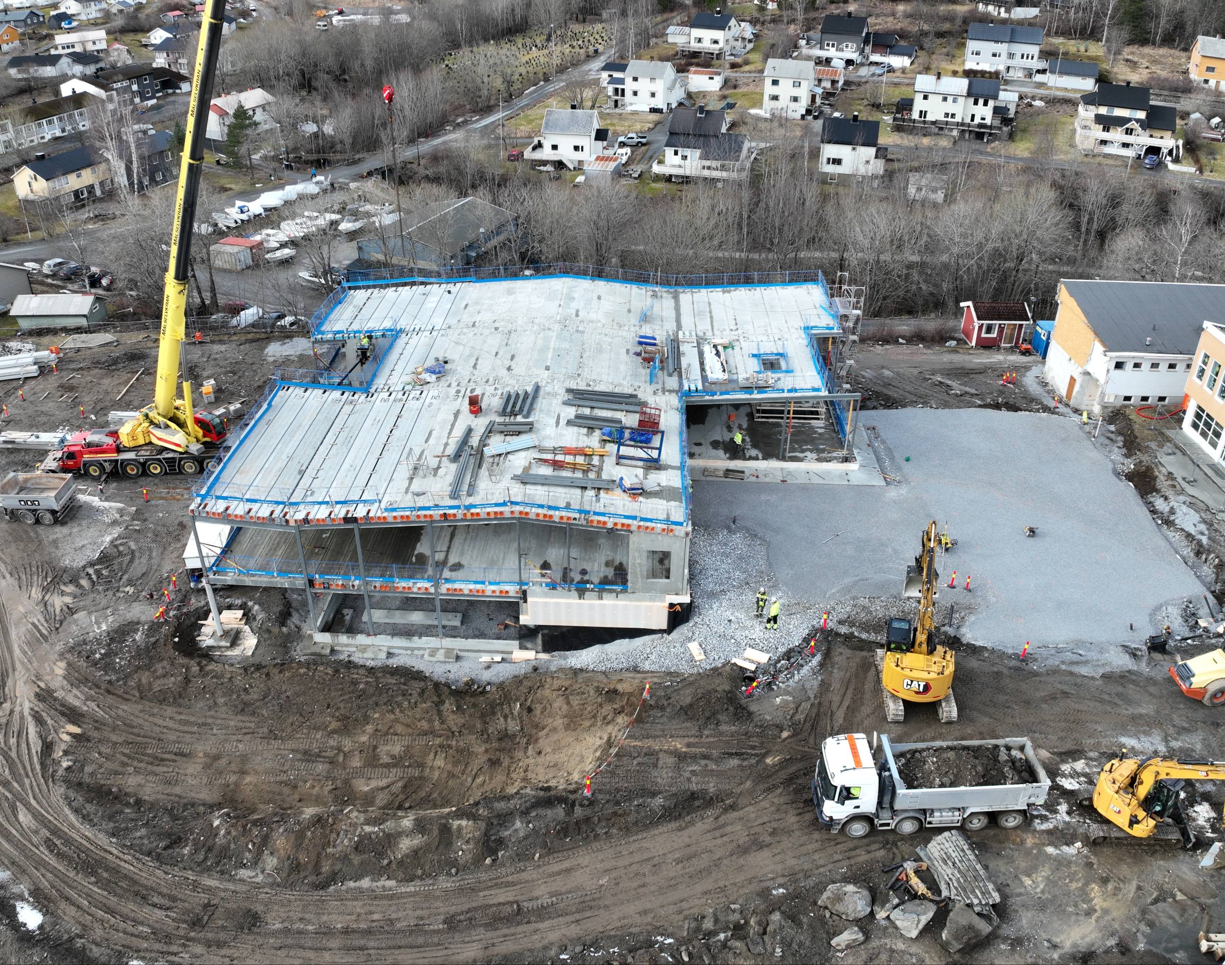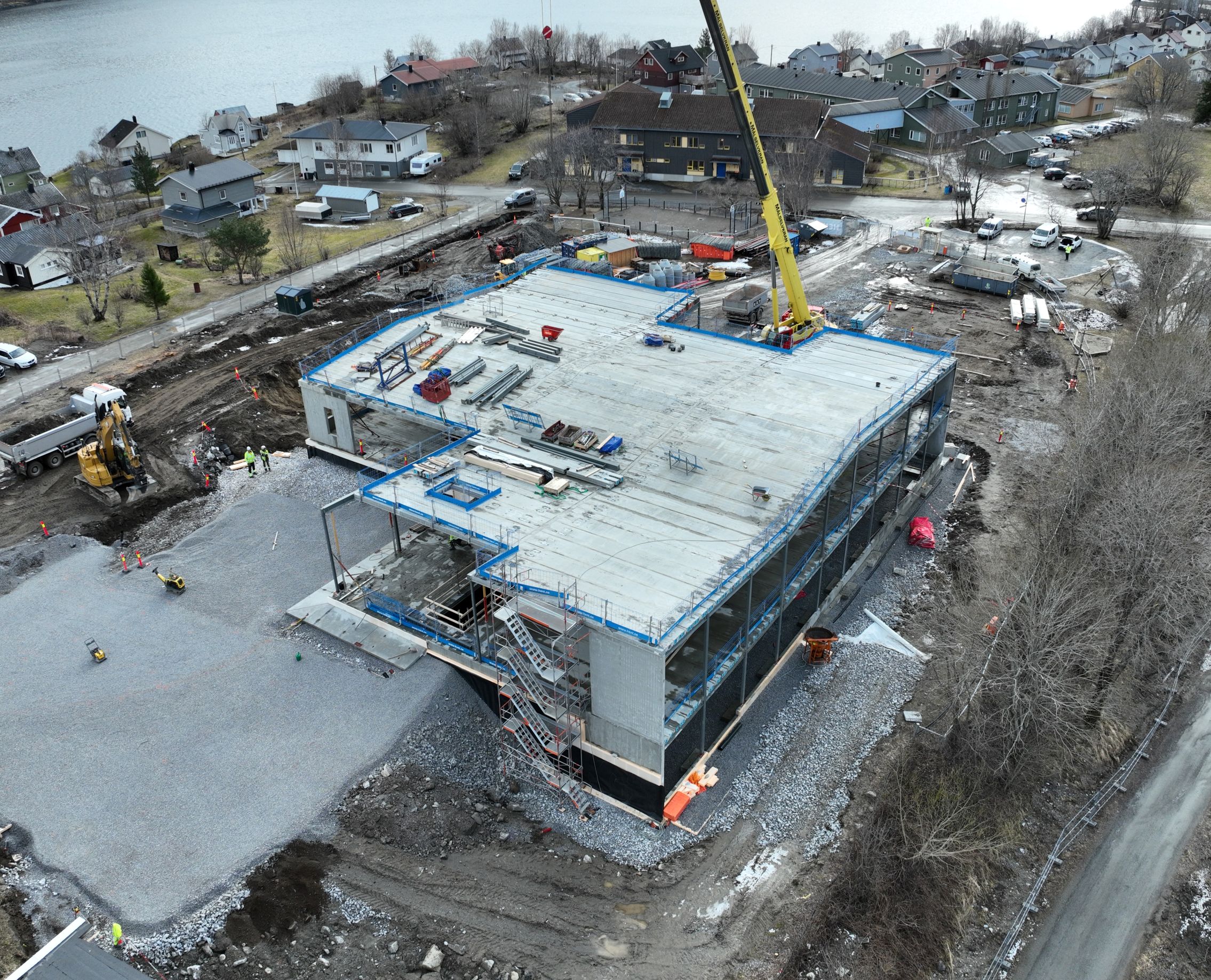 Per uke 13 er råbygget for skoledelen ferdigstilt. Det gjenstår nå kun barnehagedelen før hele råbygget er ferdig montert. Dette arbeidet planlegges gjennomført i løpet av de første ukene etter påske. Råbygget leveres og monteres av Element Nor i samarbeid med Målselvkran Montasje.