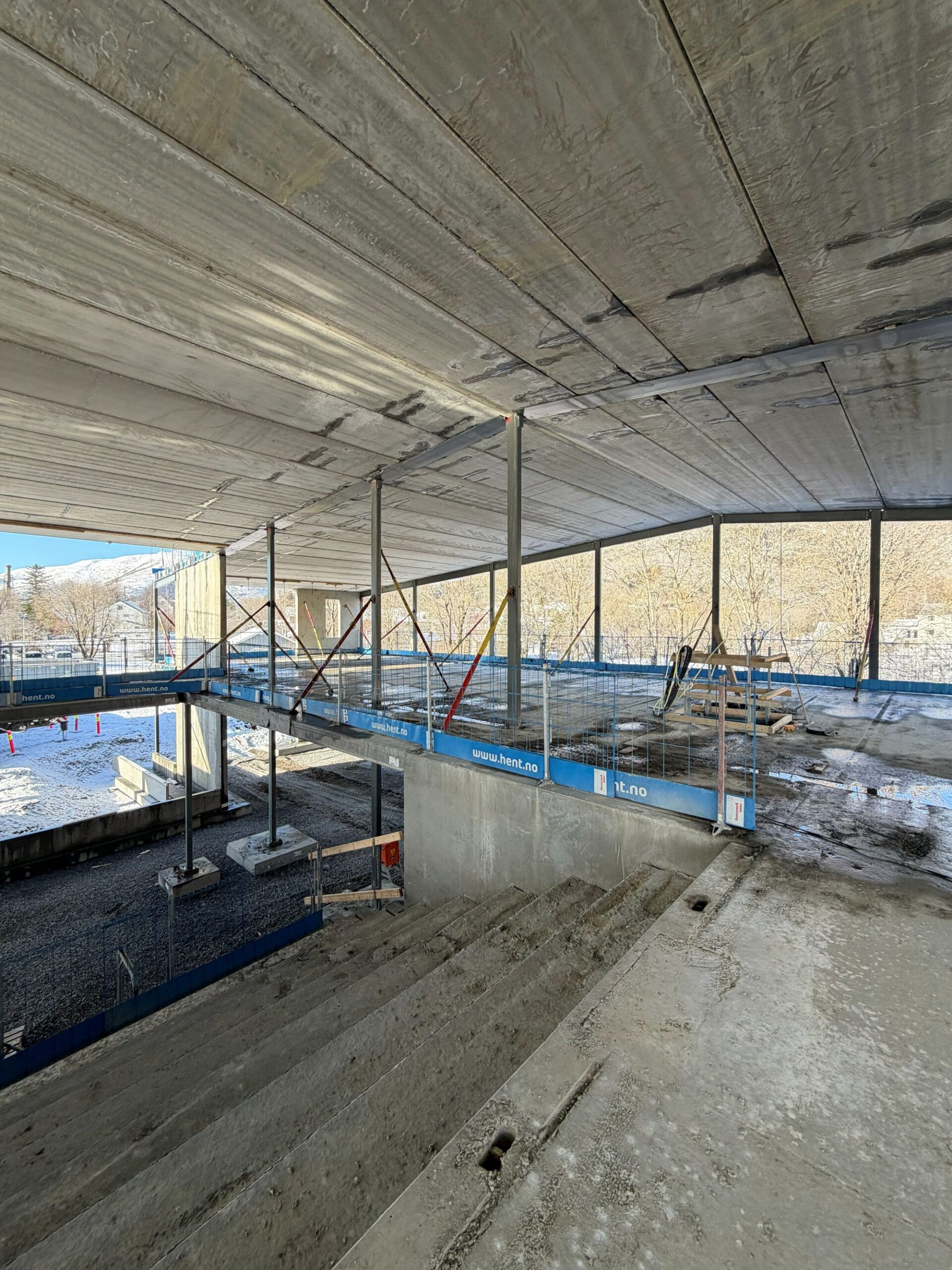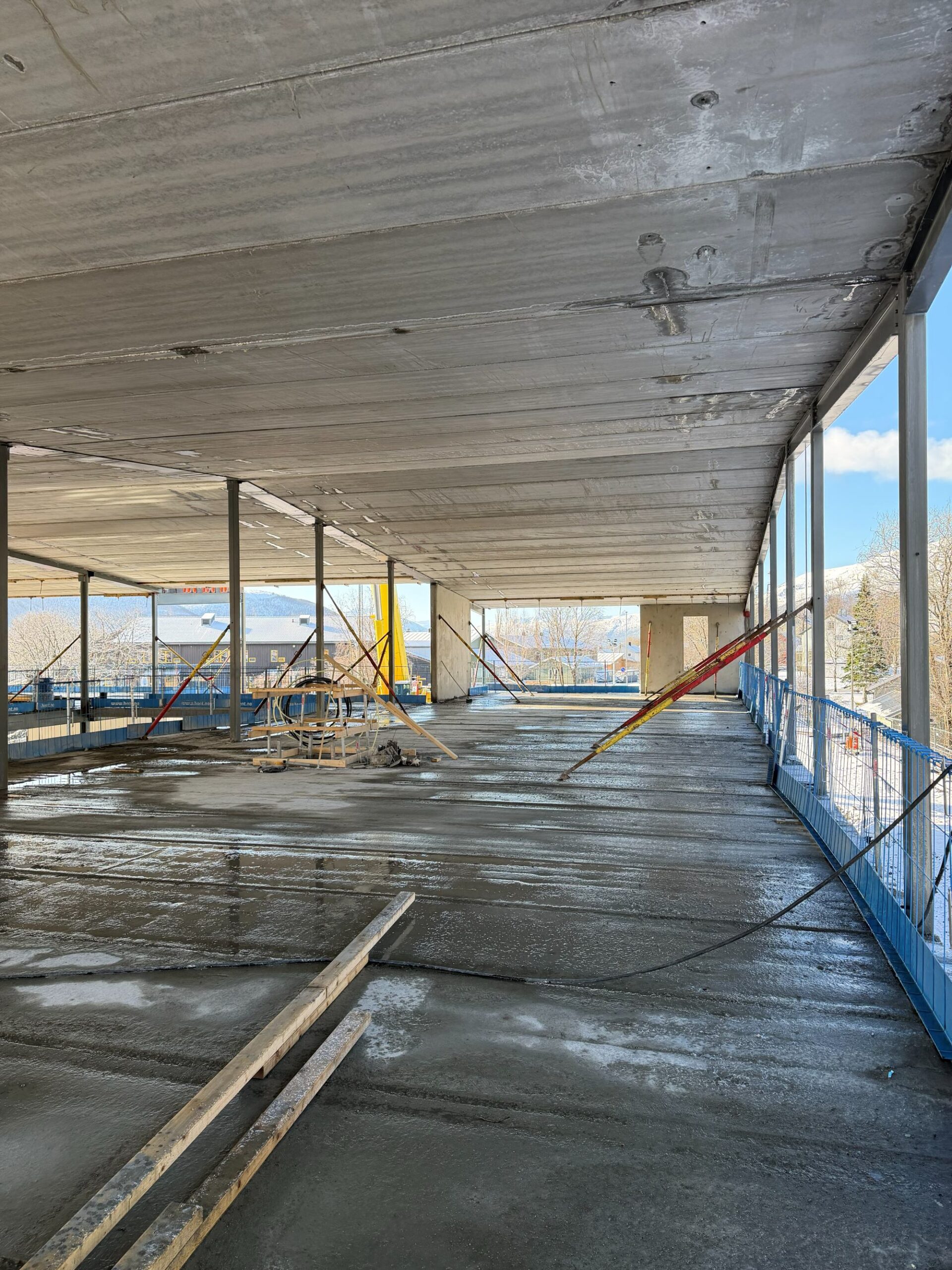 Grunnarbeidene utføres av Kran og Entreprenørtjenester AS, som nå har ferdigstilt grunn i plan 2, hvor barnehagedelen skal etableres. Etter påske starter videre arbeider, herunder legging av bunnledninger, innfylling av masser, brannisolering samt montering av ytterveggselementer og taktekking.