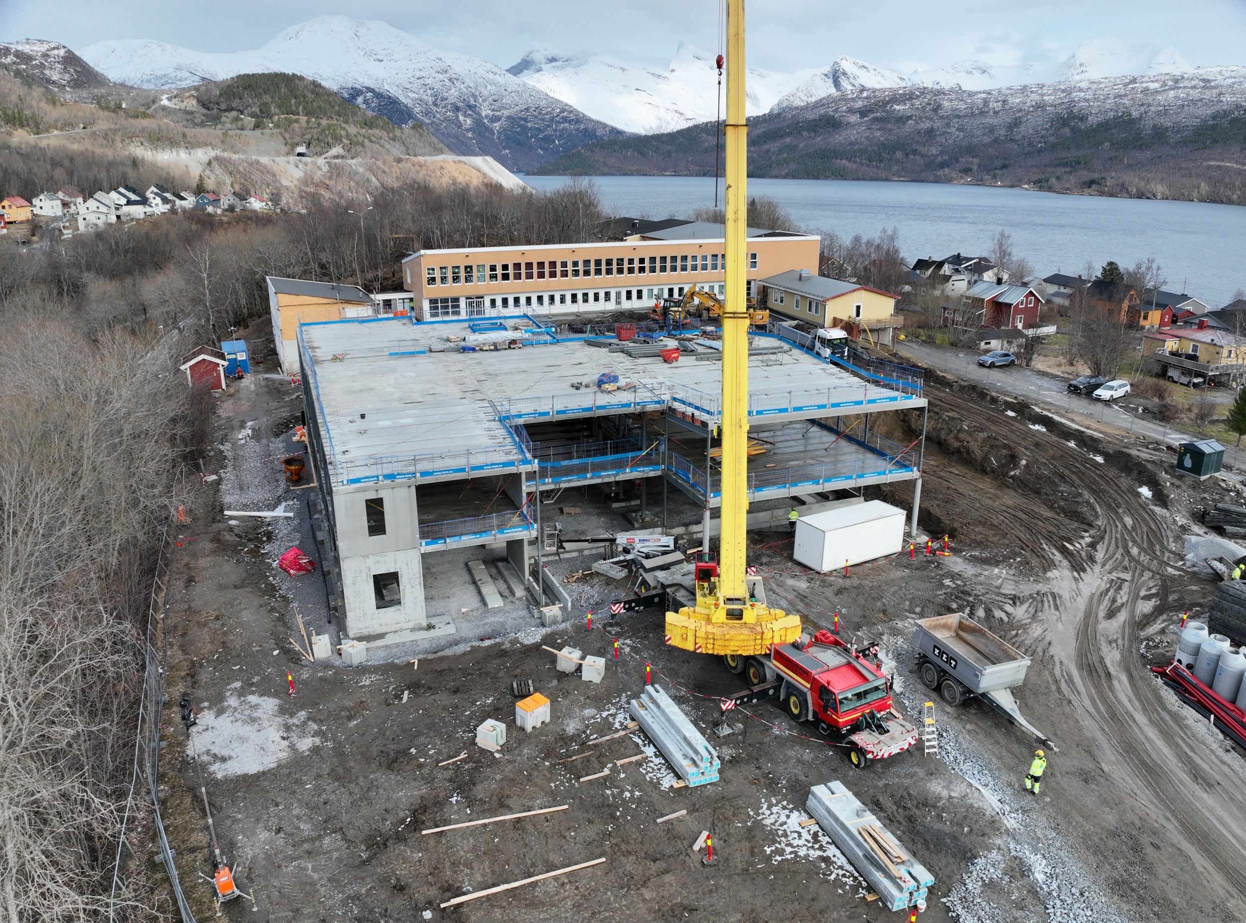 Per uke 13 er råbygget for skoledelen ferdigstilt. Det gjenstår nå kun barnehagedelen før hele råbygget er ferdig montert. Dette arbeidet planlegges gjennomført i løpet av de første ukene etter...