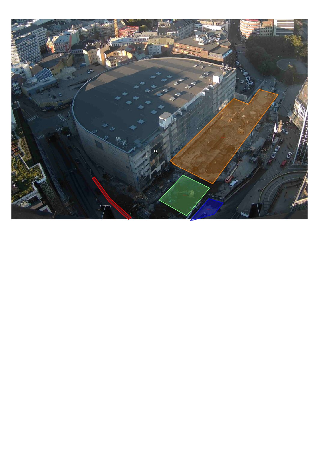 Mens gjenstående arbeider forbundet med rivning pågår i oransje sone (markert under), har forberedelsene til spunting under høyblokken pågått – og oppstart arbeider med nedsetting av spunt starter i uke 40. Dette arealet er markert med grønt under.